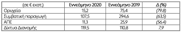 Ο κύκλος εργασιών, μειώθηκε το εννεάμηνο 2020 κατά €88 εκατ. ή 2,4% λόγω του μειωμένου όγκου πωλήσεων κατά 4.137 GWh ή 14,2%, συνεπεία της απώλειας μεριδίου αγοράς και της πτώσης της ζήτησης.