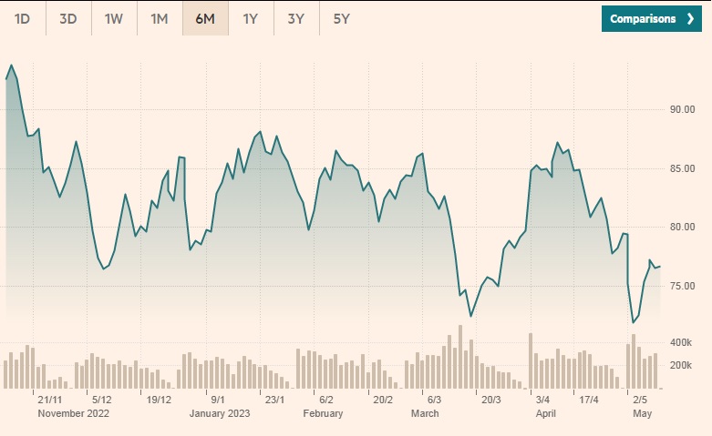 (Διακύμανση τιμών Brent, τελευταίων έξη μηνών. Πηγή: FT.com)