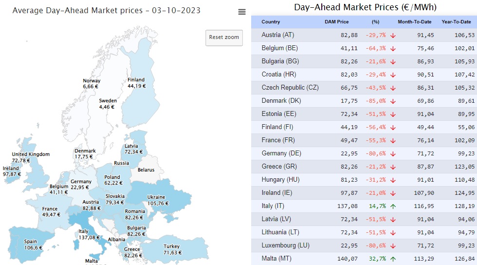 (Ευρωπαϊκός χάρτης τιμών ηλεκτρισμού της Αγοράς Επόμενης Ημέρας- Πηγή: ΡΑΑΕΥ)