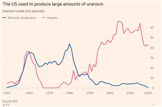 Όπως τονίζει, μιλώντας στους FT, η γεωπολιτική οδηγεί τις τιμές υψηλότερα λόγω των ανησυχιών ότι η κύρια οδός εξαγωγής ουρανίου από το Καζακστάν και το Ουζμπεκιστάν με προορισμό τις ΗΠΑ διασχίζει τη Ρωσία και το λιμάνι της Αγίας Πετρούπολης. Το 2022 το Καζακστάν, το Ουζμπεκιστάν και η Ρωσία παρείχαν λίγο λιγότερο από το ήμισυ του συνόλου του ουρανίου που αγόρασαν οι πυρηνικοί σταθμοί των ΗΠΑ, σύμφωνα με στοιχεία της αμερικανικής κυβέρνησης.