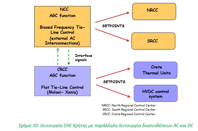 Με την υλοποίηση και της διασύνδεσης ΣΡ, το ΣΗΕ Κρήτης θα συνεχίσει να λειτουργεί σε συγχρονισμό με το ΕΣΜΗΕ μέσω της διασύνδεσης AC. Η διασύνδεση DC θα λειτουργεί με έλεγχο τάσης DC στο άκρο του συνδέσμου στην Αττική και έλεγχο ενεργού ισχύος στο άκρο της Κρήτης ενώ και στις δύο πλευρές εκατέρωθεν του συνδέσμου θα πραγματοποιείται έλεγχος τάσεως στην πλευρά ΕΡ των σταθμών μετατροπής. Σε αυτή την περίπτωση, η εφαρμογή αυτόματου ελέγχου παραγωγής του Συστήματος Ελέγχου Ενέργειας θα αποστέλλει πλέον σημεία αναφοράς του επιθυμητού επιπέδου ενεργού ισχύος στο σύστημα ελέγχου της διασύνδεσης ΣΡ (HVDC control system) με σκοπό τη διατήρηση σταθερής ροή ισχύος στην διασύνδεση ΕΡ στο επιθυμητό επίπεδο. Ο παραπάνω τρόπος λειτουργίας αποτυπώνεται ενδεικτικά στο Σχήμα 10.