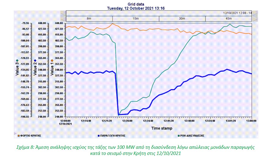 Στο Σχήμα 8 φαίνεται η συμπεριφορά του συστήματος μετά την εκδήλωση ισχυρής σεισμικής δόνησης (12ης Οκτωβρίου 2021) με επίκεντρο το Αρκαλοχώρι. Η σεισμική δόνηση οδήγησε σε απώλεια παραγωγής 100 MW στην Κρήτη που καλύφθηκαν με άμεση ανάληψη της απωλεσθείσας ισχύος από τη διασύνδεση χωρίς περαιτέρω συνέπειες για το σύστημα και τους καταναλωτές της Κρήτης.