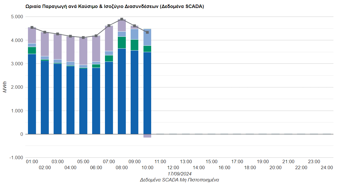 Σημειώνουμε πως στις 10 το πρωί, σήμερα Τρίτη, το μερίδιο του φυσικού αερίου στην ωριαία παραγωγή φθάνει στο 78% ή 7.500 MWh και των ΑΠΕ στο μόλις 16%, ή 713 MWh – η συμμετοχή των μεγάλων υδροηλεκτρικών εμφανίζεται κάπως αυξημένη, στο 6%, ή 269 MWh.