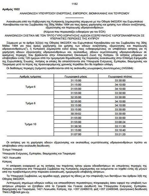 Η κυπριακή κυβέρνηση, δια του υπουργού Ενέργειας Γιώργου Λακκοτρύπη και του κυβερνητικού εκπροσώπου Νίκου Χριστοδουλίδη, ανακοίνωσε την έναρξη του 3ου γύρου χορήγησης αδειών έρευνας υδρογονανθράκων στα ερευνητικά υπεράκτια τεμάχια 6, 8 και 10 της Αποκλειστικής Οικονομικής Ζώνης της Κυπριακής Δημοκρατίας.