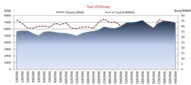 Στα 41,31€/MWh έκλεισε ο Ιούνιος ενώ το Μάιο ήταν στα 41,25€/MWh.