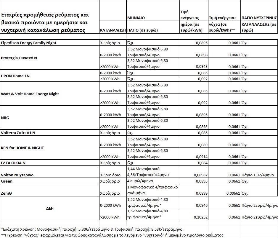 ενέργειας ανά προμηθευτή στα οποία συμπεριλαμβάνονται και οι τιμές χρέωσης με