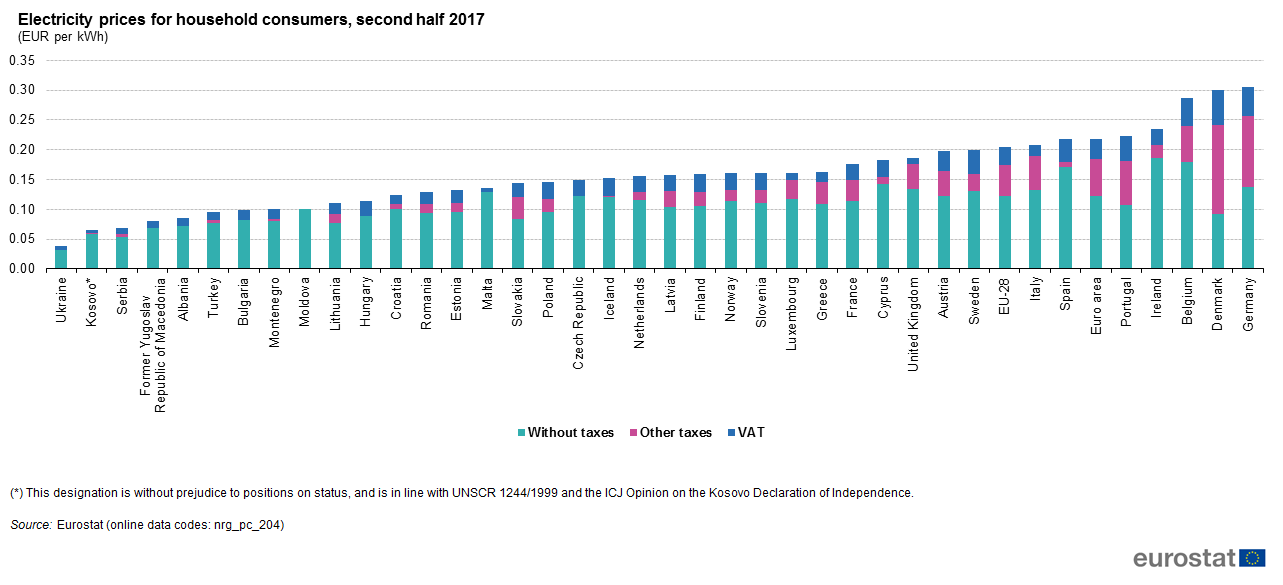 Σύμφωνα με τα στοιχεία της υπηρεσίας, μεταξύ των κρατών μελών της ΕΕ, οι τιμές ηλεκτρικής ενέργειας για τους οικιακούς καταναλωτές κατά το δεύτερο εξάμηνο του 2017 κυμάνθηκαν από € 10 /100 kWh στη Βουλγαρία έως και πάνω από € 30 ευρώ /100 kWh σε Δανία και Γερμανία.