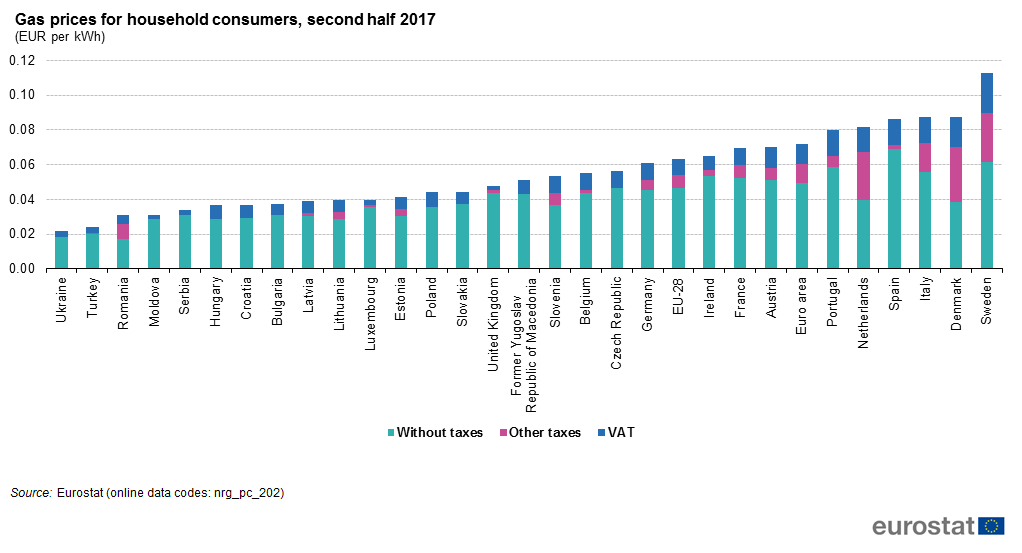 Μεταξύ των κρατών μελών, οι τιμές του αερίου για τα νοικοκυριά κατά το δεύτερο εξάμηνο του 2017 κυμάνθηκαν από περίπου € 3 /100 kWh στη Ρουμανία έως σχεδόν € 9 /100 kWh στη Δανία και πάνω από € 11 /100 kWh στη Σουηδία.