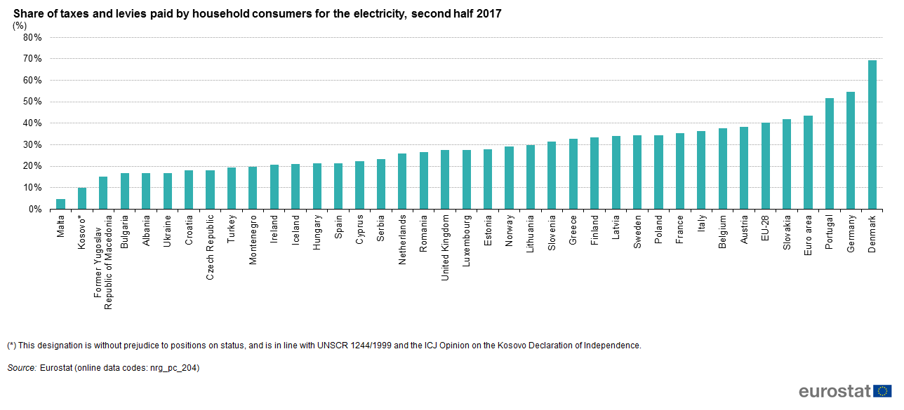 Το μερίδιο των φόρων και εισφορών επί του συνόλου του κόστους της ηλεκτρικής ενέργειας για τους οικιακούς καταναλωτές κατά το δεύτερο εξάμηνο του 2017 διαφοροποιόταν σημαντικά μεταξύ των κρατών μελών, κυμαινόμενο από το 69% της συνολικής τιμής της ηλεκτρικής ενέργειας στη Δανία και 55% στη Γερμανία, έως και μόλις 5% στη Μάλτα.
