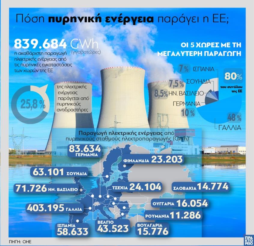 Η κύρια χρήση της πυρηνικής ενέργειας, όπως αναφέρει το ΑΠΕ-ΜΠΕ, είναι για την παραγωγή ηλεκτρικής ενέργειας. Το 2016, η ακαθάριστη παραγωγή ηλεκτρικής ενέργειας από πυρηνικές εγκαταστάσεις εντός των κρατών μελών της ΕΕ ανερχόταν σε 839.6847 γιγαβατώρες (GWh). Με άλλα λόγια, τα πυρηνικά εργοστάσια παρήγαγαν περίπου το ένα τέταρτο (25,8%) της ηλεκτρικής ενέργειας που παράγεται στην ΕΕ το 2016.