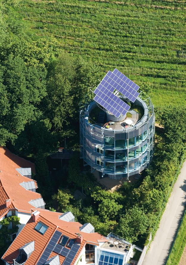 Eνα ηλιοτρόπιο μεγαλώνει στο Φράιμπουργκ: Το πολυβραβευμένο «Ηλιοτρόπιο» (1993-1994), του πρωτοπόρου αρχιτέκτονα παθητικών και ηλιακών κτιρίων Ραλφ Ντις, είναι το πλέον εμβληματικό του κτίριο της πόλης, ένα ορόσημο που συμβολίζει την νέα ενεργειακή φιλοσοφία. Περιστρέφεται όπως και το φυτό ώστε το φωτοβολταϊκό σύστημα στην οροφή του να ακολουθεί την πορεία του ήλιου και να επιτυγχάνεται ο βέλτιστος φυσικός φωτισμός και να μεγιστοποιείται η παραγωγή ηλεκτρικής ενέργειας. Το αποτέλεσμα είναι η παραγωγή ενεργειακού πλεονάσματος κατά πέντε φορές, με το οποίο τροφοδοτούνται γειτονικές κατοικίες. Τις πολύ ζεστές μέρες του καλοκαιριού γυρίζει την θερμομονωμένη του πλάτη στον ήλιο και παραμένει δροσερό. Διαθέτει επίσης ένα σύστημα συλλογής ομβρίων υδάτων, ενώ χάρη σε ένα ηλιακό-θερμικό σύστημα σωλήνων ζεσταίνεται το νερό και θερμαίνεται το κτίριο.