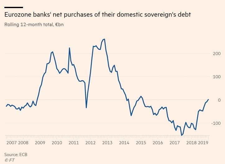 Τα ίδια τα στοιχεία της ΕΚΤ, ωστόσο, δείχνουν ότι οι τράπεζες της ευρωζώνης άρχισαν πρόσφατα για μια ακόμα φορά να αυξάνουν την διακράτηση κρατικού χρέους: απέκτησαν ένα καθαρό ποσό 1 δισεκατομμυρίου ευρώ κρατικού χρέους των χωρών τους 12 μήνες που ολοκληρώθηκαν τον Ιανουάριο.
