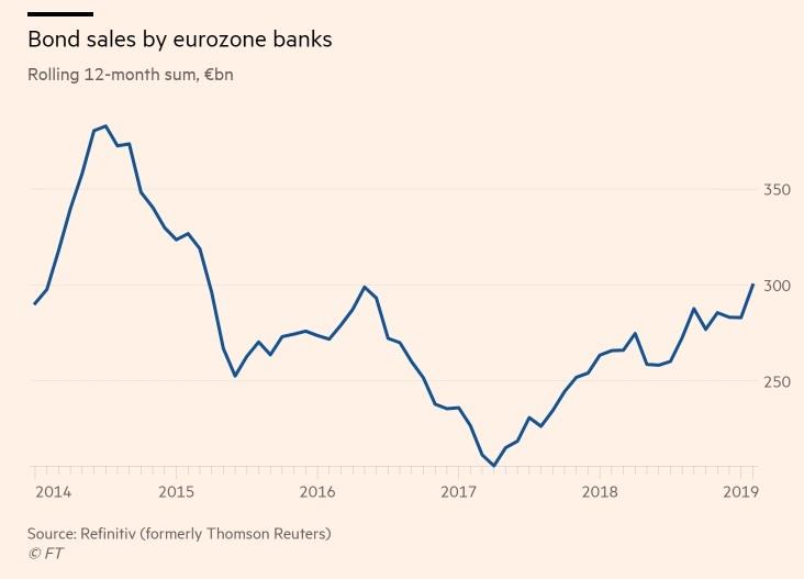 Τα τελευταία χρόνια η EKT έχει εισφέρει 700 δισ. ευρώ στους ισολογισμούς των τραπεζών της ευρωζώνης μέσω φθηνών δανείων. Ο τελευταίος γύρος με το προσωνύμιο «Targeted Longer-Term Refinancing Operations» ή TLTRO ξεκίνησε στα μέσα του 2016 και τα δάνεια που έδωσε ωριμάζουν την επόμενη χρονιά και το 2021, μια εξέλιξη που θα οδηγούσε τις τράπεζες σε αναζήτηση εναλλακτικών πηγών χρηματοδότησης. Οι τελευταίες έχουν ήδη επιταχύνει από πέρυσι την άντληση κεφαλαίων, πουλώντας ομόλογα αξίας 300 δισ. ευρώ τη χρονιά που ολοκληρώθηκε στα τέλη Φεβρουαρίου, σύμφωνα με στοιχεία από την πάροχο δεδομένων Refinitiv. Αυτό ήταν το μεγαλύτερο ποσό από το Μάρτιο του 2015.