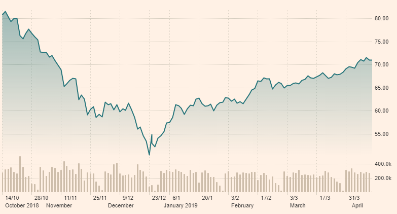 Πορεία των τιμών του Brent στο ICE του Λονδίνου κατά το τελευταίο εξάμηνο