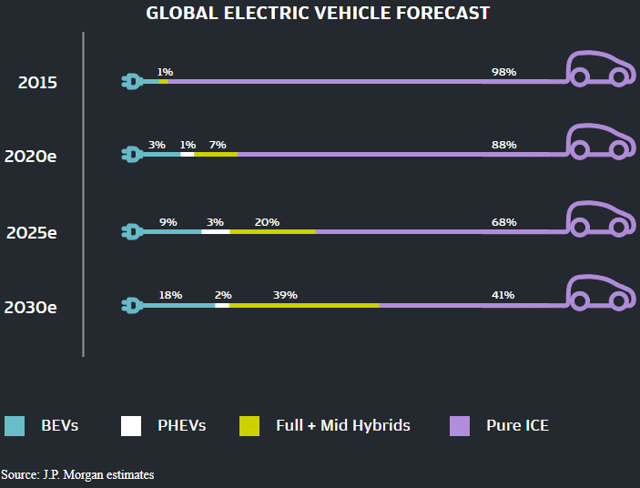 Σύμφωνα με έκθεση της JP Morgan η αυτοκινητοβιομηχανία υφίσταται ριζική μεταμόρφωση, με τoυς περισσότερους κατασκευαστές να συμφωνούν ότι τα επόμενα 10 χρόνια θα συμβούν περισσότερες αλλαγές από τις δύο προηγούμενες δεκαετίες. Στην ίδια έκθεση επισημαίνεται ότι έως το 2025 τα αμιγώς ηλεκτρικά οχήματα και τα υβριδικά ηλεκτρικά οχήματα θα αντιπροσωπεύουν περίπου το 30% όλων των πωλήσεων, επιφέροντας μεγάλες αλλαγές όχι μόνο στην ίδια την αυτοκινητοβιομηχανία αλλά στους κλάδους της ασφάλισης, της αγοράς καυσίμων και των δικτύων ενέργειας.