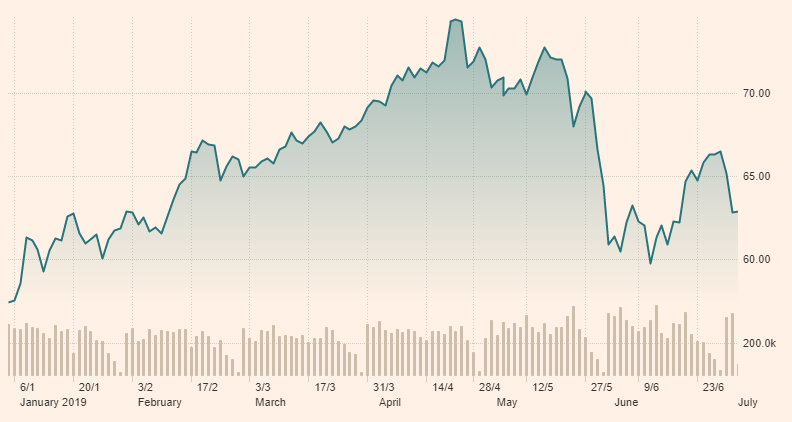 Πορεία των τιμών του Brent στο ICE του Λονδίνου κατά το τελευταίο εξάμηνο