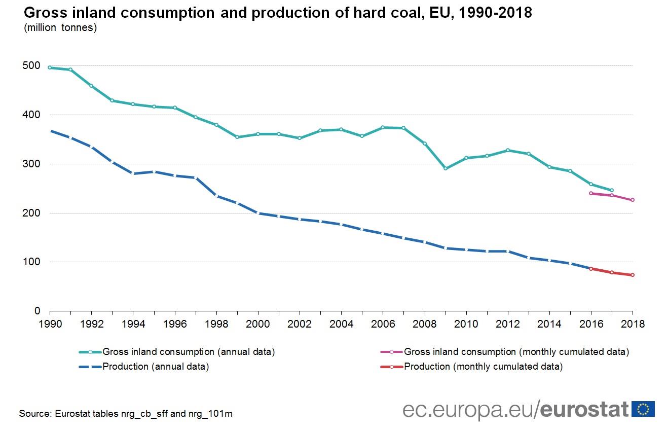 Εξάλλου, πτωτική τάση κατέγραψε το 2018, η κατανάλωση άνθρακα στην Ευρωπαϊκή Ένωση. Σύμφωνα με τα διαθέσιμα στοιχεία, από 497 εκατομμύρια τόνους το 1990, έφτασε στα 226 εκατομμύρια τόνους το 2018. Μόνο πέντε κράτη - μέλη της Ευρωπαϊκής Ένωσης παρήγαγαν πέρυσι άνθρακα και τις τρεις πρώτες θέσεις καταλαμβάνουν η Πολωνία (63,4 εκατομμύρια τόνους ή το 86% του συνόλου της παραγωγής στην ΕΕ), η Τσεχία (4,5 εκατ. τόνους)και η Γερμανία (2,8 εκατ. τόνους).