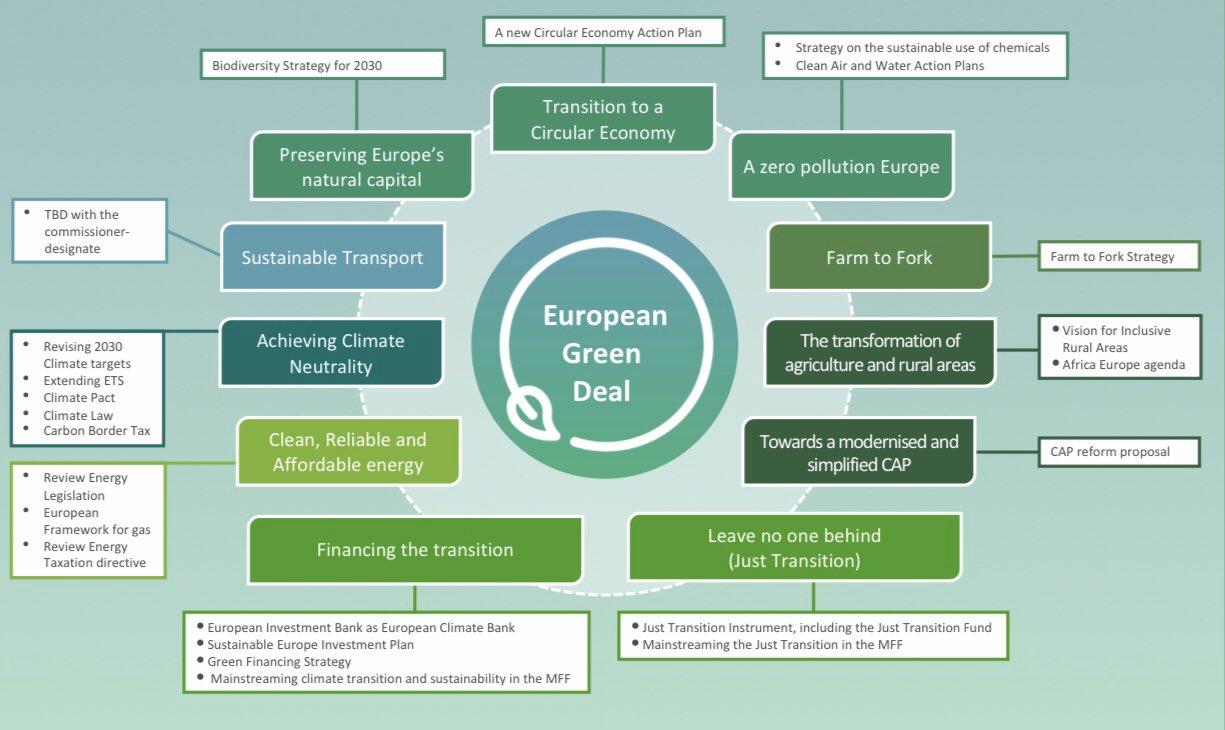 Η Ευρωπαϊκή Πράσινη Συμφωνία (Green Deal) έχει ως στόχο να γίνει η Ευρώπη η πρώτη κλιματικά ουδέτερη ήπειρος και θα εστιάσει στην καταπολέμηση της κλιματικής αλλαγής -και σ’ άλλους στόχους- για την προστασία του περιβάλλοντος σε τομείς όπως οι μεταφορές, η ενέργεια, η ρύπανση, η αγροτική παραγωγή, η κυκλική οικονομία και η βιοποικιλότητα.