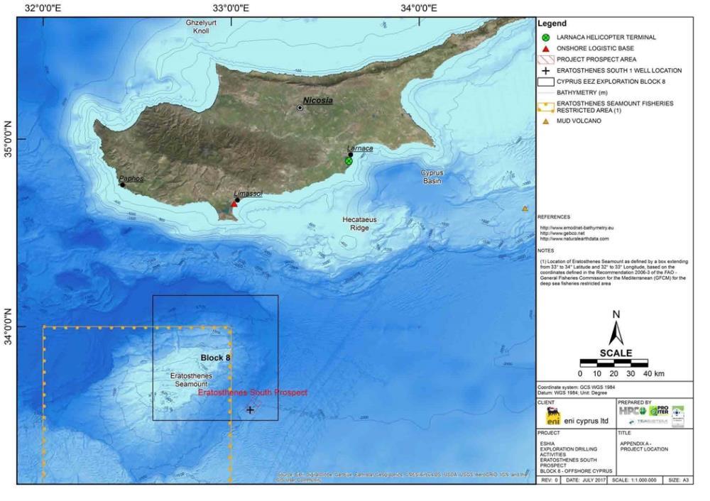 Στο τέλος του 2017 η ΕΝΙ προχώρησε και σε διαδικασίες αδειοδότησης στον εν λόγω στόχο. Πρόκειται για τον στόχο «Ερατοσθένης Νότιο» και το σημείο γεώτρησης είχε καθοριστεί το σημείο «3», ακριβώς λόγω και της διαμόρφωσης, κλήσεων κ.τ.λ. της επιφάνειας του βυθού.