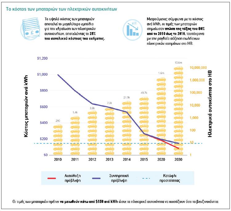 Μετρημένες με το κόστος κιλοβατώρας ανά ώρα, οι τιμές των μπαταριών μειώθηκαν κατά 80% από 1,000 δολάρια ανά kWh, σε περίπου 227 δολάρια ανά kWh μεταξύ 2010 και 2016. Για να καταστούν ευθέως ανταγωνιστικά με τα αυτοκίνητα συμβατικών κινητήρων βενζίνης, θα πρέπει αυτό το κόστος να μειωθεί κάτω από τα 150 δολάρια ανά kWh, ενδεχομένως και κάτω από τα 100 δολάρια, όσο και αν ακούγεται μη ρεαλιστικό για να επιτευχθεί τουλάχιστον βραχυπρόθεσμα.