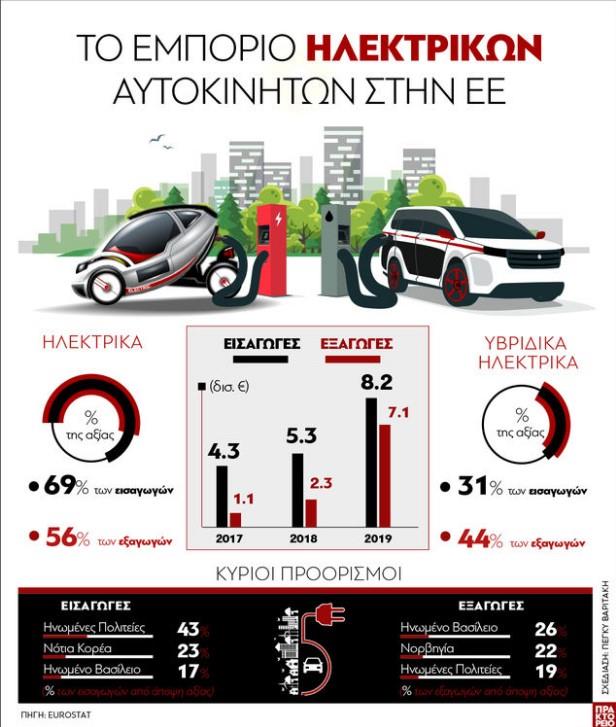 Κατά το 2019, η Ευρωπαϊκή Ένωση εξήγαγε ηλεκτρικά και υβριδικά ηλεκτρικά αυτοκίνητα συνολικής αξίας 8,2 δισeεκατομμύρια ευρώ, σύμφωνα με τα στοιχεία της Eurostat που αποτυπώνονται στο παρακάτω γράφημα.