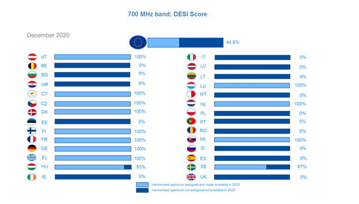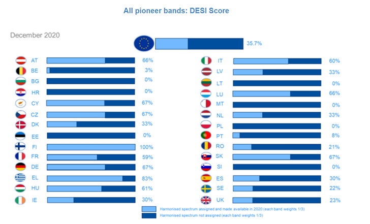 Η κατέχουσα την πρώτη θέση Φινλανδία, έχει εναρμονίσει και αποδώσει το 100% των συχνοτήτων 5G. Μετά την Ελλάδα, στην τρίτη θέση της σχετικής κατάταξης, βρίσκονται η Γερμανία, η Κύπρος, η Τσεχία και Σλοβακία, με ποσοστό 67% έκαστη.