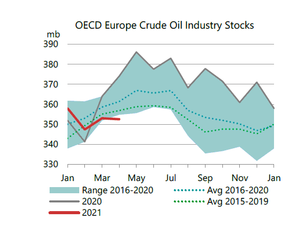 Η υψηλότερη ζήτηση καλύπτεται σήμερα κυρίως από την σταδιακά αυξανόμενη παραγωγή από τους OPEC+ καθώς παρατηρείται μερική άρση των ποσοστόσεων ανά χώρα, βάση της απόφασης του καρτέλ τον Απρίλιο του 2020 για μείωση της παραγωγής, αλλά και από τους ανεξάρτητους παραγωγούς κυρίως σε ΗΠΑ, Καναδά, Νορβηγία, Βραζιλία κα. Ένα άλλο σημαντικό μέρους της αυξανόμενης ζήτησης καλύπτεται από την εμφανή πλέον μείωση των αποθεμάτων του Ο.Ο.Σ.Α τα οποία βρίσκονται στο επίπεδο των 2,926 εκατ.βαρελιών, από τα 3,218 που είχαν βρεθεί τον Ιούλιο του 2020. Βλέπε γράφημα: