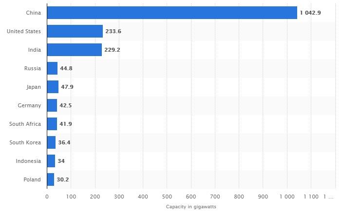 (Xωρητικότητα ισχύος άνθρακα σε γιγαβάτ, ανά χώρα)