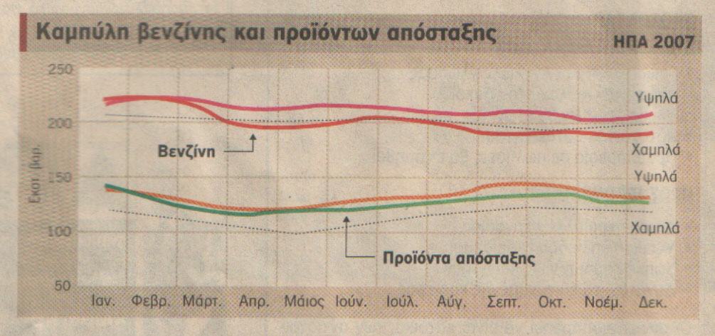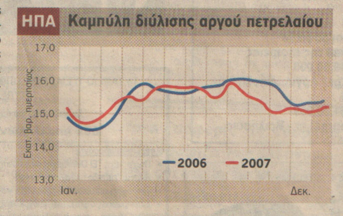 Οι παρούσες προς διύλιση ποσότητες αργού υπολείπονται αυτών των αντιστοίχων της περυσινής περιόδου, ενώ είναι βέβαιο ότι μόνο χαμηλές θερμοκρασίες στην ανατολική ακτή θα δημιουργήσουν προϋποθέσεις ανάγκης αύξησης παραγωγής λόγω ζήτησης. Διαφορετικά όποια παραγωγή θα καταλήξει σε αποθήκευση. Το πρώτο ήμισυ του έτους 2007 η ζήτηση βενζίνης κινήθηκε κατά μέσον όρο 140 χιλ. βαρέλια την ημέρα πλέον των 9,16 εκατ. βαρ./ημ. της αντίστοιχης περιόδου του 2006, με την πρόσφατη ζήτηση να επανέρχεται στα επίπεδα της περασμένης περιόδου. Τα διυλιστήρια των ΗΠΑ πασχίζουν αρκετά ώστε να αντεπεξέρχονται των όποιων εποχιακών αυξήσεων ζήτησης, ανταποκρινόμενα στα εκάστοτε διαμορφωμένα χαμηλά του περασμένου έτους, αποφεύγοντας ξαφνικές εισόδους αγοράς αργού, καθώς και τις αντίστοιχες εντάσεις στη ναυλαγορά.
