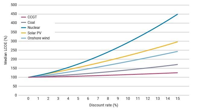 (Επίδραση του προεξοφλητικού επιτοκίου στο ισοσταθμισμένο κόστος ηλεκτρικής ενέργειας (LCOE) για διάφορες τεχνολογίες. Πηγή: ΟΟΣΑ)