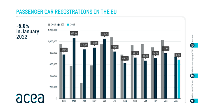 Τον Ιανουάριο του 2022 , οι ταξινομήσεις επιβατικών αυτοκινήτων στην ΕΕ συνέχισαν να μειώνονται, με τη συνεχιζόμενη έλλειψη ημιαγωγών να εξακολουθεί να επηρεάζει αρνητικά τις πωλήσεις αυτοκινήτων σε ολόκληρη την περιοχή.