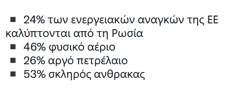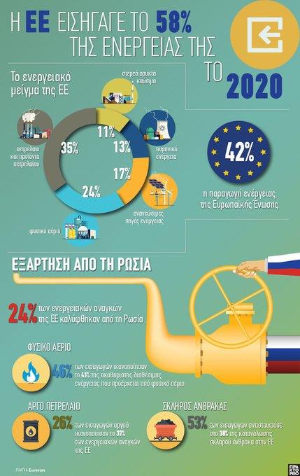 Το παρακάτω Infographics από το ΑΠΕ-ΜΠΕ παριστά τις εισαγωγές ενέργειας της ΕΕ από τη Ρωσία, σύμφωνα με στοιχεία της Eurostat: