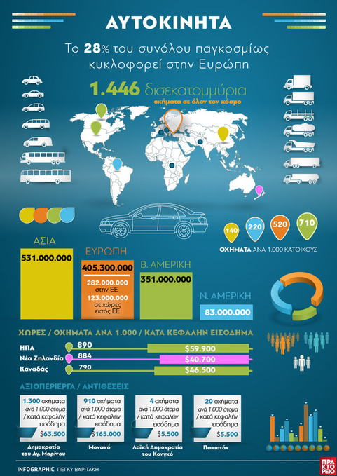Σύμφωνα με τα στοιχεία που αποτυπώνονται στο παρακάτω γράφημα του ΑΠΕ-ΜΠΕ, η Ασία έχει 531 εκατ. οχήματα, ακολουθεί η Ευρώπη με 405,3 εκατ. και πιο πίσω είναι η Βόρεια Αμερική με 351 εκατ. οχήματα: