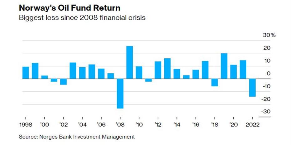 Οπως μεταδίδει το Bloomberg, το ταμείο που διαχειρίζεται τον ορυκτό πλούτο της Νορβηγίας έχασε 14,1% το 2022, που ισοδυναμεί με περίπου 164 δισ. δολάρια, σύμφωνα με δήλωση που έκανε σήμερα Τρίτη. Είναι ο μεγαλύτερος μεμονωμένος κάτοχος μετοχών στον κόσμο και οι αποδόσεις του εξαρτώνται σε μεγάλο βαθμό από τις κινήσεις της αγοράς.