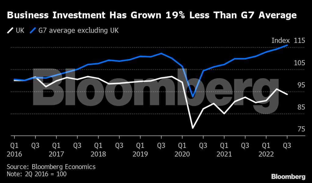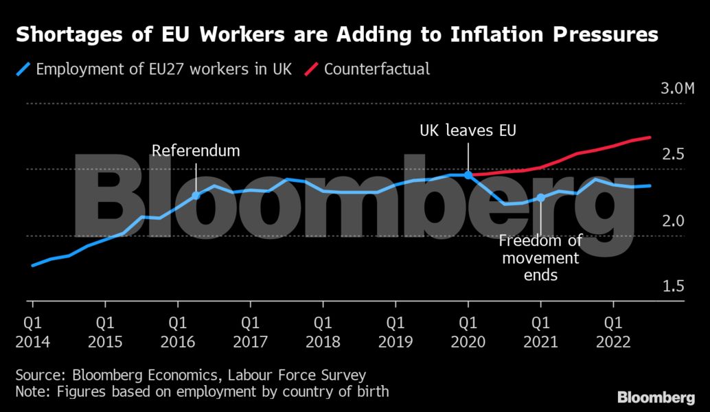 Οικονομολόγοι της Bloomberg Economics υπολογίζουν ότι το διαζύγιο από την ΕΕ, που φέρει τη σφραγίδα του Συντηρητικού Κόμματος της χώρας, έχει συρρικνώνει την οικονομία κατά 4% απ’ ό,τι θα μπορούσε να ήταν με τις επιχειρηματικές επενδύσεις να υστερούν σημαντικά και την έλλειψη εργαζομένων από χώρες της ΕΕ να αυξάνεται.
