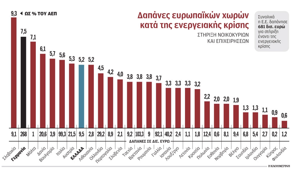 Η Ελλάδα δαπάνησε 9,5 δισ. ευρώ για τη θωράκιση της οικονομίας της από την ενεργειακή κρίση και το ποσό αυτό αντιστοιχεί στο 5,2% του ελληνικού ΑΕΠ.