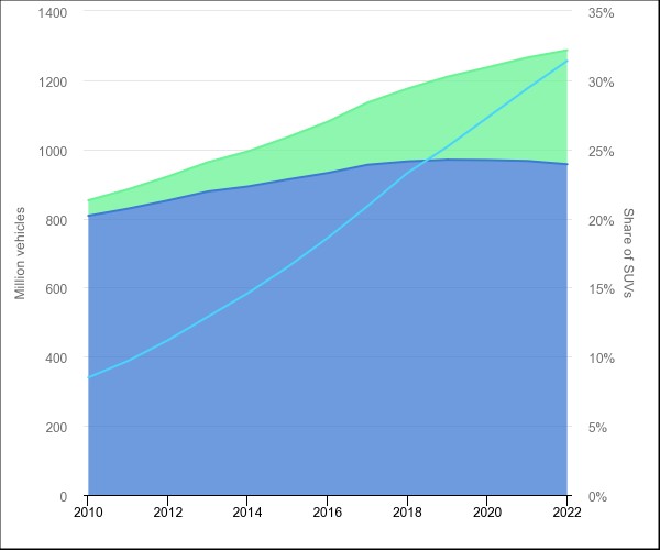 Σύμφωνα με τον ΙΕΑ, μέσα στο 2022, οι πωλήσεις SUVs συνέχισαν να αυξάνονται αγγίζοντας διεθνώς τα 330 εκατ. οχήματα, παρά το γεγονός ότι οι συνολικές πωλήσεις αυτοκινήτων υποχώρησαν. Αυτό προκάλεσε μια σημαντική ενίσχυση στους παραγόμενους ρύπους διοξειδίου του άνθρακα σχεδόν στο 1 δισ. τόνους.