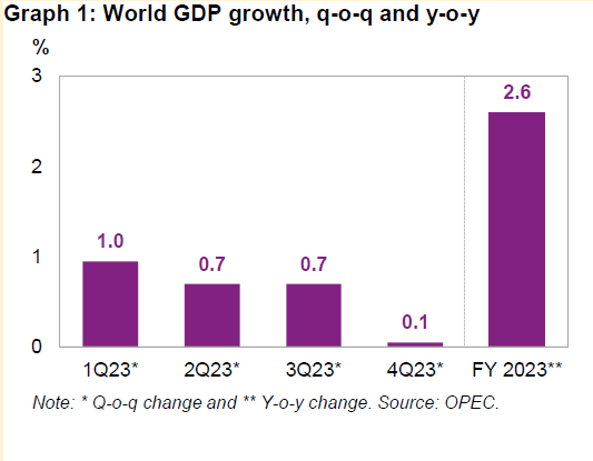 Ο OPEC διατηρεί την πρόβλεψή του για την παγκόσμια οικονομική ανάπτυξη για το 2023 στο 2,6% και επισημαίνει ότι η δυναμική επιβραδύνεται.Σύμφωνα με το παρακάτω γράφημα, που περιλαμβάνεται στην τρέχουσα έκθεση του καρτέλ, η ανάπτυξη πιθανόν να επιβραδυνθεί στο 0,1% σε τριμηνιαία βάση κατά το τελευταίο τρίμηνο του έτους: