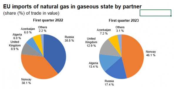 Αναφορικά με το φυσικό αέριο, το ποσοστό της Ρωσίας μειώθηκε στο 17,4% από 38,1% των συνολικών εισαγωγών, με τη Νορβηγία να γίνεται ο αδιαμφισβήτητος βασικός προμηθευτής της ΕΕ με ένα ποσοστό 46,1%, ενώ σημαντική άνοδο σημειώνει και το ποσοστό της Αλγερίας που έφθασε το 13,4% από 6% πέρυσι.