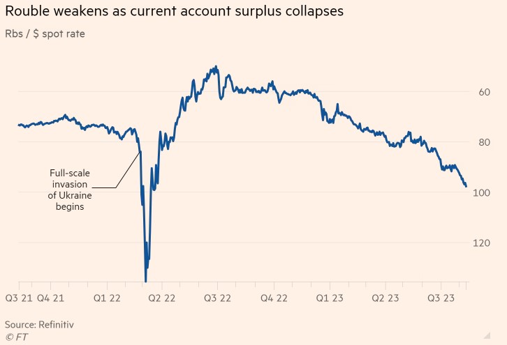 Η κεντρική τράπεζα της Ρωσίας κατηγόρησε για την αποδυνάμωση του ρουβλίου την πτώση των εσόδων από τις εξαγωγές και την ανάκαμψη των εισαγωγών. Ένας σύμβουλος του Κρεμλίνου δήλωσε τη Δευτέρα ότι ευθύνεται η χαλαρή νομισματική πολιτική.