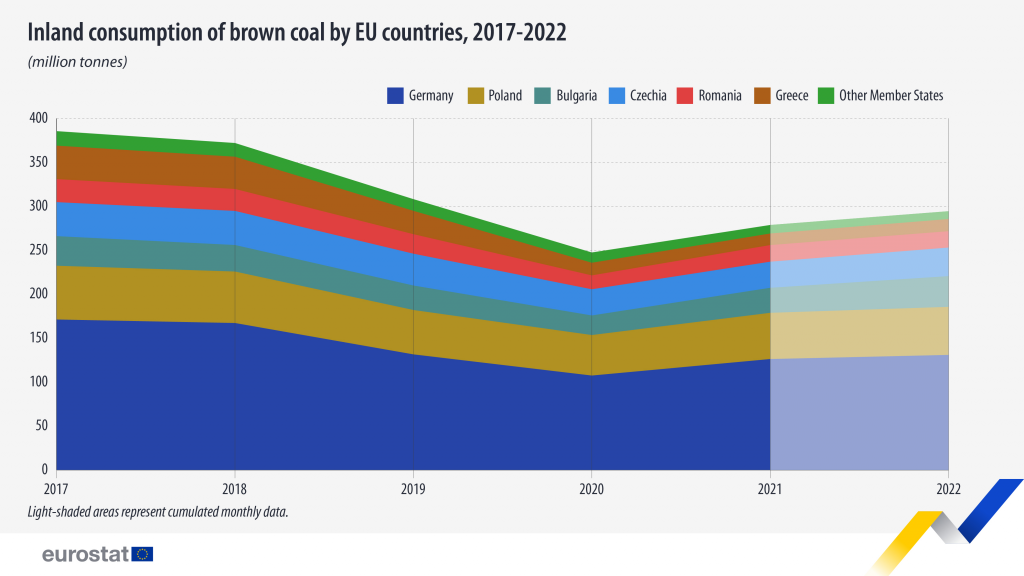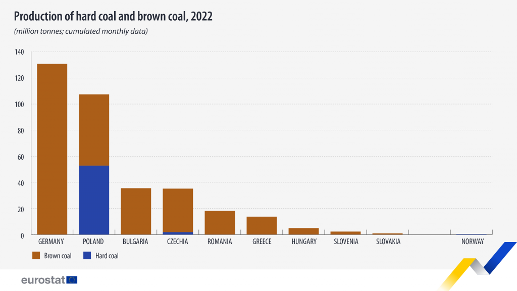 Η ΕΕ παρήγαγε 294 εκατομμύρια τόνους καφέ άνθρακα το 2022 (αύξηση 6% από το 2021). Παρά την πρόσφατη ανάκαμψη, η παραγωγή παρέμεινε κάτω από τα προ πανδημίας επίπεδα του 2019. Σήμερα, ο καφέ άνθρακας παράγεται από 9 μέλη της ΕΕ, με τη Γερμανία να πρωτοστατεί ως κύριος παραγωγός. Πέρυσι, η Γερμανία (131 εκατομμύρια τόνοι) αντιπροσώπευε περίπου το 44% της συνολικής παραγωγής καφέ άνθρακα στην ΕΕ. Τα άλλα κράτη μέλη που παράγουν καφέ άνθρακα και λιγνίτη είναι η Πολωνία (19%), η Βουλγαρία (12%), η Τσεχία (11%), η Ρουμανία, η Ελλάδα, η Ουγγαρία, η Σλοβενία και η Σλοβακία.