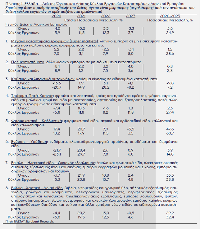 Η ανάλυσή της Eurobank βασίζεται στους δείκτες όγκου και κύκλου εργασιών λιανικού εμπορίου που δημοσιεύει κάθε μήνα η Ελληνική Στατιστική Αρχή (ΕΛΣΤΑΤ). Ο μεν πρώτος μετρά την αξία των πωλήσεων του λιανικού εμπορίου σε σταθερές τιμές, δηλαδή η μεταβολή του δείχνει την αύξηση ή τη μείωση του όγκου των πωλούμενων αγαθών, ο δε δεύτερος μετρά την αξία των πωλήσεων του λιανικού εμπορίου σε τρέχουσες τιμές, δηλαδή η μεταβολή του περιλαμβάνει τόσο τις αυξομειώσεις του όγκου των πωλούμενων αγαθών όσο και τις αυξομειώσεις των τιμών χρέωσης.