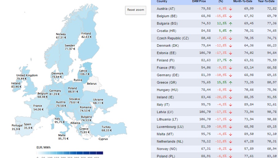 Σε αντίθεση, οι περισσότερες αγορές ηλεκτρικής ενέργειας στην Ευρώπη καταγράφουν αρνητικά πρόσημα χονδρεμπορικών τιμών, με εξαίρεση τέσσερις χώρες, μεταξύ των οποίων και η Ελλάδα.