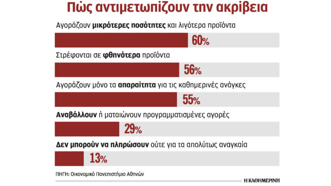 Επιπλέον, το 69% συγκρίνει πάντα τις τιμές πριν προβεί σε αγορές, το 62% προγραμματίζει τις αγορές του πριν πάει για ψώνια, ενώ έρευνα τιμών κάνει ακόμη και μέσα στο κατάστημα χρησιμοποιώντας το κινητό του τηλέφωνο (σε ποσοστό 20%). Πολύ πιο εύκολα πλέον αλλάζουν μάρκα εάν αυτή πωλείται φθηνότερα (σε ποσοστό 69%). Ενδεικτικό της αλλαγής προτεραιοτήτων που έχει επιφέρει η ακρίβεια είναι ότι ενώ το 2019 το 64% δήλωνε ότι ενδιαφέρεται για την ποιότητα των προϊόντων και ήταν διατεθειμένο να πληρώσει περισσότερο γι’ αυτήν, το αντίστοιχο ποσοστό το 2023 ήταν 43%, ενώ το 2022 είχε υποχωρήσει ακόμη περισσότερο, φτάνοντας στο 39%.