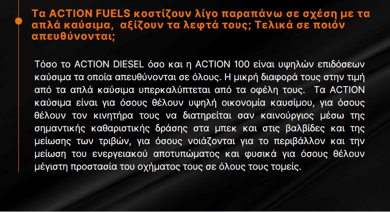 Τόσο το ACTION DIESEL όσο και η ACTION 100 είναι υψηλών επιδόσεων καύσιμα τα οποία απευθύνονται σε όλους. Η μικρή διαφορά τους στην τιμή από τα απλά καύσιμα υπερκαλύπτεται από τα οφέλη τους. Τα ACTION καύσιμα είναι για όσους θέλουν υψηλή οικονομία καυσίμου, για όσους θέλουν τον κινητήρα τους να διατηρείται σαν καινούργιος μέσω της σημαντικής καθαριστικής δράσης στα μπεκ και στις βαλβίδες και της μείωσης των τριβών, για όσους νοιάζονται για το περιβάλλον και την μείωση του ενεργειακού αποτυπώματος και φυσικά για όσους θέλουν μέγιστη προστασία του οχήματος τους σε όλους τους τομείς.