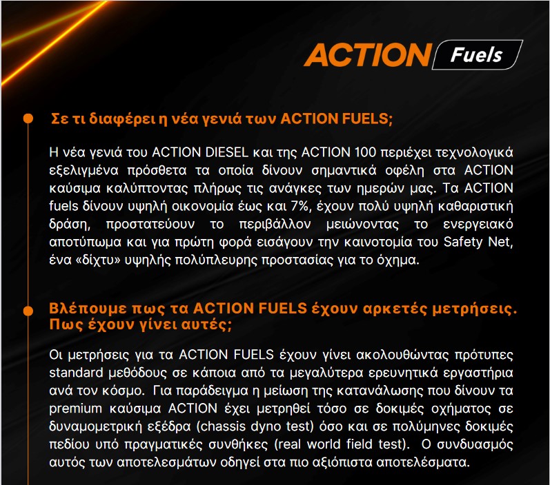 Η νέα γενιά του ACTION DIESEL και της ACTION 100 περιέχει τεχνολογικά εξελιγμένα πρόσθετα τα οποία δίνουν σημαντικά οφέλη στα ACTION καύσιμα καλύπτοντας πλήρως τις ανάγκες των ημερών μας. Τα ACTION fuels δίνουν υψηλή οικονομία έως και 7%, έχουν πολύ υψηλή καθαριστική δράση, προστατεύουν το περιβάλλον μειώνοντας το ενεργειακό αποτύπωμα και για πρώτη φορά εισάγουν την καινοτομία του Safety Net, ένα "δίχτυ" υψηλής πολύπλευρης προστασίας για το όχημα.