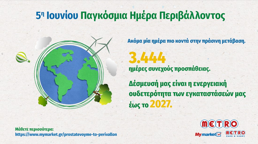 3.444 ημέρες αδιάκοπης προσπάθειας για τη METRO, η οποία συνεχίζει με το ίδιο πάθος προς την πράσινη μετάβαση, στοχεύοντας στην επίτευξη μίας σημαντικής δέσμευσης: «Την ενεργειακή ουδετερότητα των εγκαταστάσεών της έως το 2027», συμβάλλοντας έμπρακτα & ουσιαστικά ώστε οι επόμενες γενεές να ζήσουν σε ένα καλύτερο περιβάλλον.