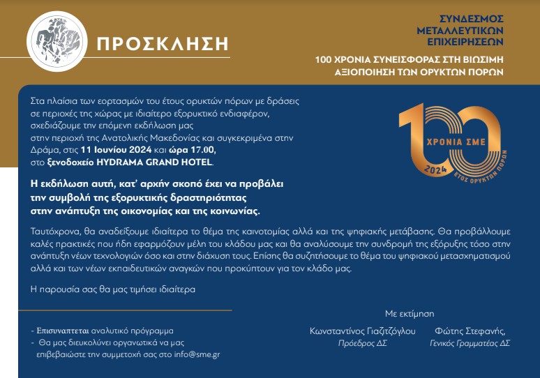 Ο Σύνδεσμος Μεταλλευτικών Επιχειρήσεων (ΣΜΕ) διοργανώνει νέα ημερίδα που θα πραγματοποιηθεί στη Δράμα, στις 11 Ιουνίου 2024 και ώρα 17.30, στο ξενοδοχείο HYDRAMA GRAND HOTEL, με τίτλο “Καινοτομία και Ψηφιακή Μετάβαση στην Εξορυκτική Βιομηχανία - Εφαρμογές και προκλήσεις”. Η ημερίδα θα καλύψει τις παρακάτω θεματικές: Καινοτομία, εκπαίδευση, ψηφιακός μετασχηματισμός, συμβολή του εξορυκτικού κλάδου στην κοινωνία και την οικονομία της χώρας. Ο ΣΜΕ ανοίγει τον διάλογο για το μέλλον του κλάδου σε όλη την Ελλάδα! Δείτε εδώ το πρόγραμμα της ημερίδας του ΣΜΕ με τίτλο “Καινοτομία και Ψηφιακή Μετάβαση στην Εξορυκτική Βιομηχανία - Εφαρμογές και προκλήσεις” Ακολουθήστε το energia.gr στο Google News!Παρακολουθήστε τις εξελίξεις με την υπογραφη εγκυρότητας του energia.gr Διαβάστε ακόμα Ευχές για το 2026 Από το Energia.gr Τετ, 31 Δεκεμβρίου 2025 - 17:42 Οι 10 +1 Νομοθετικές και Μεταρρυθμιστικές Δράσεις που Έκανε Πράξη το ΥΠΕΝ το 2025 Τετ, 31 Δεκεμβρίου 2025 - 16:45 Δύσκολο το '25 για τους Έλληνες: Σε Διατροφή, Στέγαση και Ενέργεια το Μεγαλύτερο Μέρος του Εισοδήματος Τετ, 31 Δεκεμβρίου 2025 - 16:32 Οκτώβριος 2025: Ανάκαμψη στο Λιανεμπόριο με Πτώση Μόνο στις Πωλήσεις Καυσίμων Τετ, 31 Δεκεμβρίου 2025 - 16:22 CHN ENERGY Europe Renewable Energy Holdings S.A. - AFRY: Μελέτη για τις Προκλήσεις και Ευκαιρίες για τις ΑΠΕ στην Ελλάδα Τετ, 31 Δεκεμβρίου 2025 - 15:52
