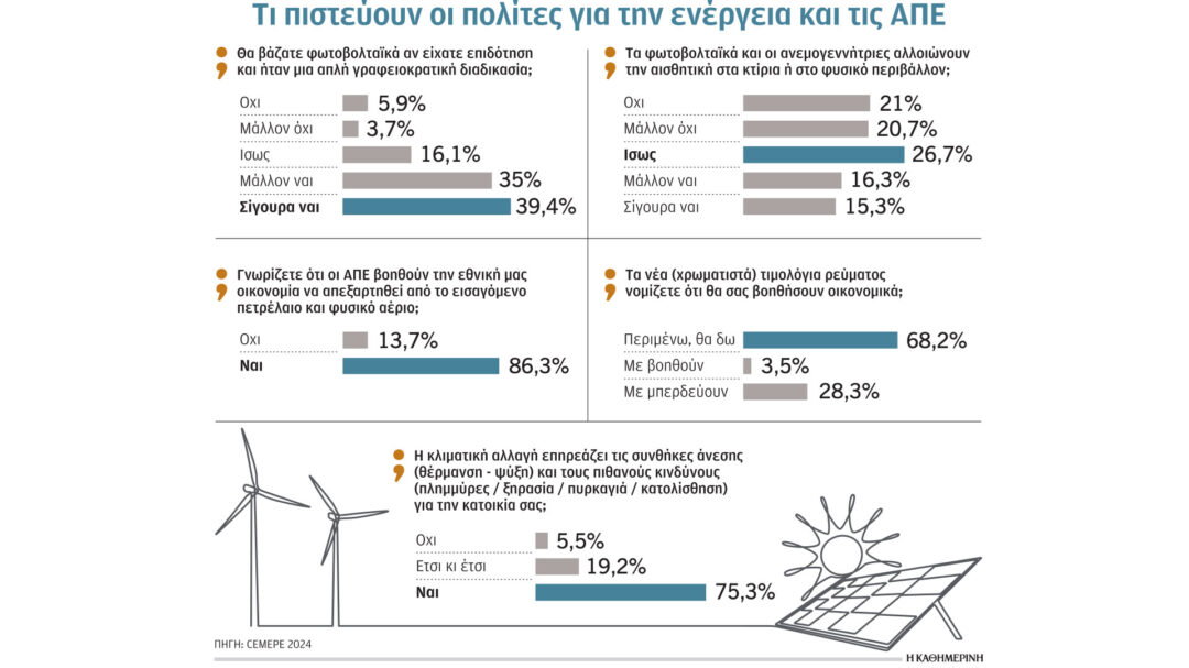 Οσον αφορά την εγκατάσταση φωτοβολταϊκών και ανεμογεννητριών, το 41,74% θεωρεί ότι μάλλον δεν αλλοιώνουν την ομορφιά των κτιρίων ή του φυσικού περιβάλλοντος. Για το 65,31% οι συχνές ενστάσεις στη χωροθέτηση ανανεώσιμων πηγών ενέργειας από τοπικές αρχές ή οργανώσεις αποτελούν κομματικές αντιπαλότητες.