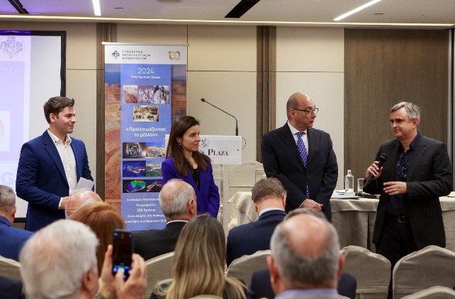 Ο βραβευθείς σπουδαστής κ. Στουπάκης, η Υφυπουργός Παιδείας κα Λυτρίβη, ο πρόεδρος του Συνδέσμου Μεταλλευτικών Επιχειρήσεων κ. Κ. Γιαζιτζόγλου και ο Αναπληρωτής καθηγητής του τμήματος Ορυκτών Πόρων Πολυτεχνείου Κρήτης κ. Γιώτης.